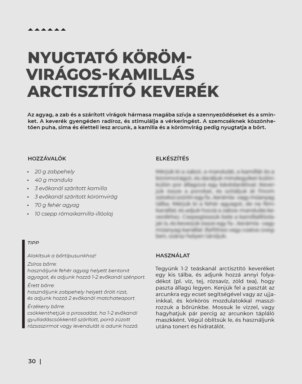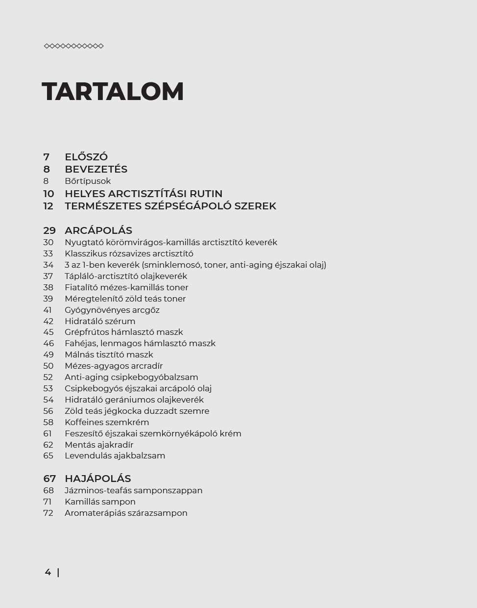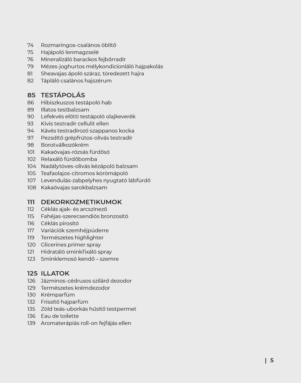 Munkácsi Brigitta első könyve, a Levendula és ecet a természetes tisztítószerek világába vezetett be minket, és óriási sikert tudhat magának a tudatos háziasszonyok körében. A kiadvány segítségével 57 receptet ismerhettek meg és próbálhattak ki az olvasók, s e tisztítószerek azóta kiváló társak lettek otthonuk tisztán tartásában. A szerző ezúttal a természetes szépségápolás trükkjeit és receptjeit osztja meg velünk. Mindegy, hogy a szórakozás, az összetevők feletti kontroll, esetleg pénztárcánk kímélése az indíték, saját szépségápolóink elkészítése olyan művészet, amely megalkuvás nélküli és biztonságos megoldást nyújt bőrünk ápolására. Általa közelebb kerülhetünk önmagunkhoz, és visszatalálhatunk a természethez is, legyen szó arc-, test- vagy hajápolásról, illatosításról, sminkelésről. Könyvünk olvasója olyan szépségápolási recepteket kap, melyekkel biztonságosan gondoskodhat mindkét otthonáról: testéről és bolygónkról is.